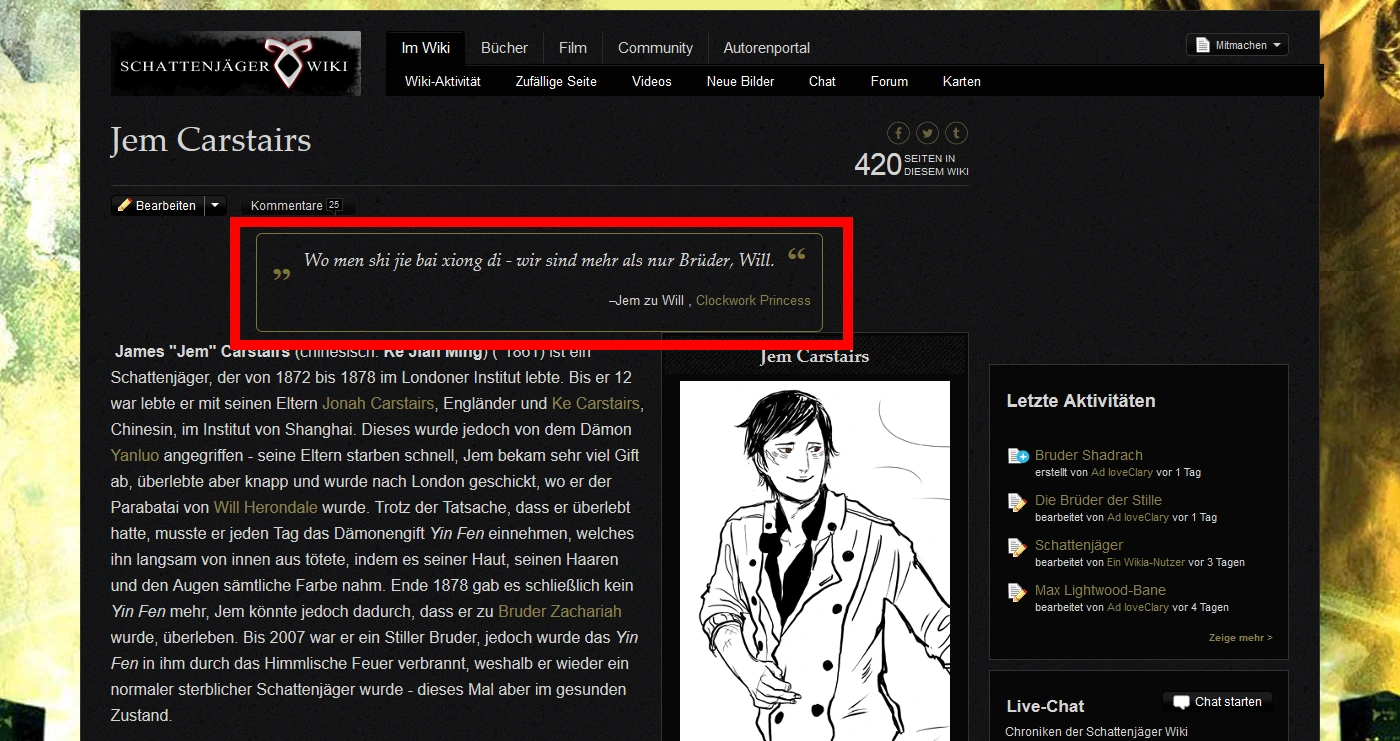 Auf vielen Seiten auf FANDOM werden Zitate verwendet, um Auszüge aus gesprochenen oder geschriebenen Worten wiederzugeben. Meistens handelt es sich dabei um Ausschnitte aus Büchern oder Artikeln, Lyrik oder aufgeschriebenen Dialogen zwischen Personen. Zum Beispiel: